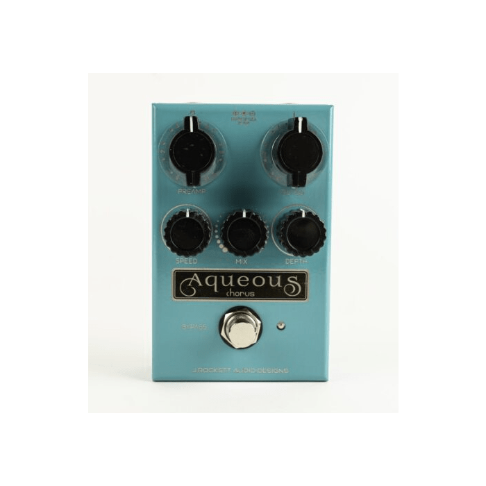 De Aqueous wordt met de hand gebouwd in de VS, is uitgerust met true bypass en zit in een stevige metalen behuizing. Voeding verloopt via een standaard 9V DC adapter (niet meegeleverd).