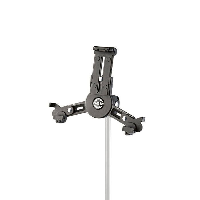De 19795 van König & Meyer is een universele tablethouder. Met uitzondering van hele grote modellen passen alle tablets in deze houder (lees hieronder welke afmetingen geschikt zijn). Dankzij de 3/8 inch schroefdraad, kunt je deze houder op elk microfoonstatief draaien. En door de drie verstelbare armen, blijft de tablet of iPad altijd op de goede positie zitten. Mocht je de tablet niet helemaal goed kunnen zien of bedienen, kunt je hem ook nog tot negentig graden draaien.