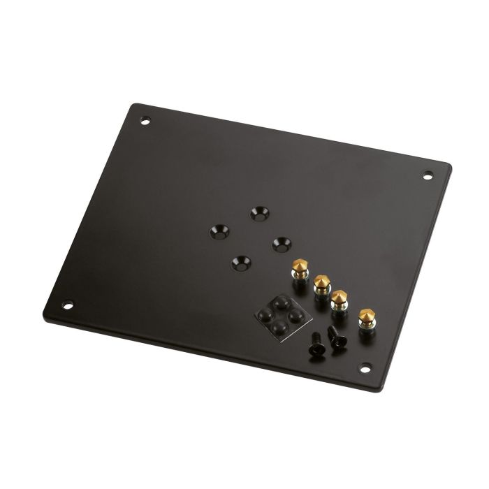 De montageplaten zijn dus verkrijgbaar in 3 verschillende maten (dit is de kleinste plaat). De montageplaat wordt geleverd incl. vier spikes en vier rubberen voetjes. En uiteraard de montageschroeven om de plaat vast te zetten aan het monitor statief.