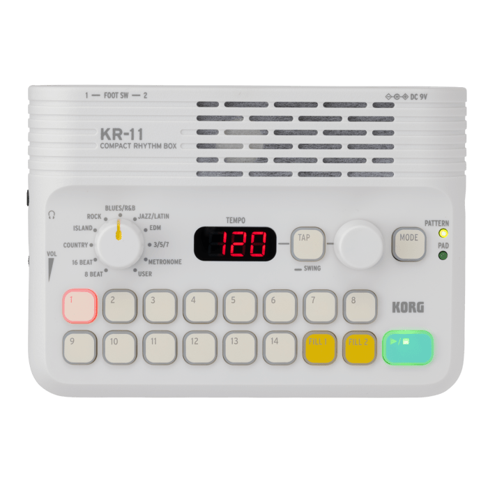 De nieuwe KR-11 is een compacte ritmemachine boordevol functies, die een draagbare oplossing biedt om variatie en plezier in je muziekpraktijk te brengen. De KR-11 compacte ritmebox brengt de erfenis van de ritmemachine in het moderne tijdperk, een pionier van de legendarische Korg Doncamatic in 1963.