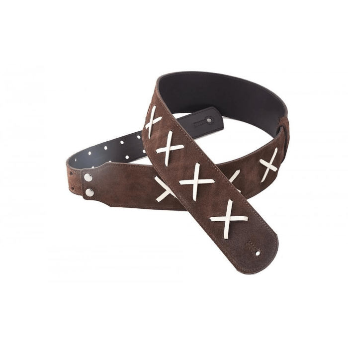 Legend D.G. Black Guitar Strap: Deze gitaarband, met gekruiste strips en oorspronkelijk in chocolade, is bijna net zo beroemd geworden als de iconische zwarte Stratocaster van zijn eigenaar. Deze keer hebben we hem echter in het zwart gemaakt omdat iemand daarom vroeg, en we vinden het prachtig hoe het geworden is.