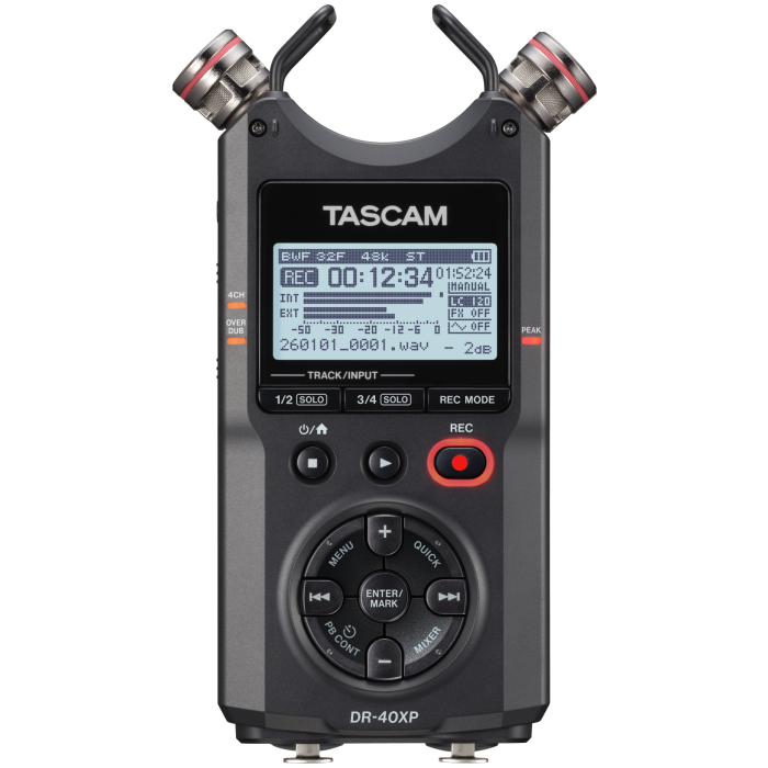 De Tascam DR-40XP is een draagbare 4-sporen field recorder voor muzikanten, videomakers, podcasters en content creators die op iedere locatie opnames in hoge kwaliteit willen maken. Dit model combineert ingebouwde stereomicrofoons, twee XLR/jack-combo-ingangen en 32-bit float-opname, zodat je snel en zonder gedoe betrouwbare resultaten vastlegt. Of je nu live muziek opneemt, omgevingsgeluid verzamelt, interviews maakt of audio rechtstreeks in je computer wilt opnemen, de DR-40XP is ontworpen om dat soepel te laten verlopen. Met vier opnamekanalen biedt de Tascam DR-40XP veel vrijheid bij uiteenlopende opnamesituaties. De ingebouwde stereomicrofoons zijn instelbaar in AB- of XY-opstelling. Daardoor kies je zelf de opnamekarakteristiek die past bij de ruimte, bron en gewenste stereoweergave. Voor wie externe microfoons wil gebruiken, beschikt deze recorder over twee stille HDDA-microfoonvoorversterkers met +48V fantoomvoeding. Zo sluit je ook condensatormicrofoons direct aan zonder extra apparatuur.