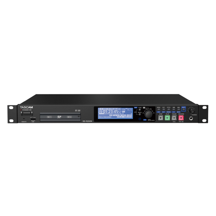 De Tascam SS-R250N is een solid-state recorder/speler voorzien van netwerk aansluiting en diverse afstandsbedieningsopties voor professionele toepassingen zoals in omroepstudio's of vaste installaties. Hij neemt op in WAV- en MP3-formaat op SD/SDHC/SDXC- en USB-flashgeheugen. Aangezien de recorder via een netwerk verbinding kan maken met een FTP-server, kan hij automatisch opnamen uploaden nadat een opname is voltooid of bestanden downloaden om af te spelen. Tijdsynchronisatie via SNTP is ook mogelijk.