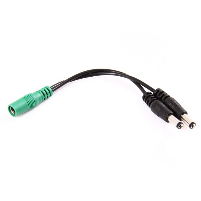 De twee male DC stekkertjes gaan in twee uitgangen en via de enkele female DC connector aan de andere kant en een regulier DC kabeltje, voorzie je gemakkelijk elke pedaal van de juist voeding.