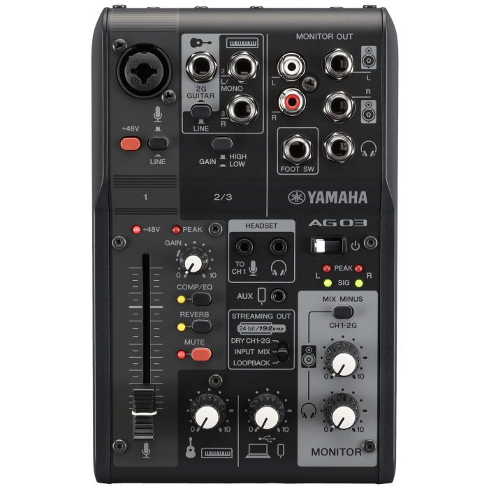 De Yamaha AG03 Mk2 is een vernieuwde, 3-kanaals mixer, ontworpen voor hoge kwaliteit audio voor (live)streams, gaming, webcasting en live muziek. Deze robuuste mixer geeft je 24-bit/192kHz audiokwaliteit, USB-connectiviteit, onboard DSP-effecten en loopback-functionaliteit. De Mk2 introduceert een 1/8-inch, 4-polige mini-I/O om een verscheidenheid aan streaming-opties mogelijk te maken, een mute-knop en een groot aantal verbeteringen aan de bouw, het ontwerp, de interne circuits en de algehele prestaties - allemaal om een geoptimaliseerde, intuïtieve bediening te garanderen zonder in te boeten aan kwaliteit. De AG-03 is de meest compacte versie uit de serie.