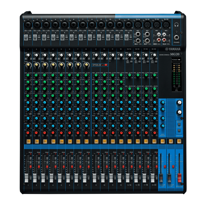 De Yamaha MG20 is een analoge mixer. De mengtafel is rijk aan functies en levert een uitstekende geluidskwaliteit. Hij is zeer geschikt voor live-sound of permanente installaties. De microfoonvoorversterkers van de MG20 zorgt ervoor dat je mix transparant en helder klinkt. Deze kristalheldere D-PRE pre-amps van de MG20 laten je microfoons geweldig klinken, met natuurlijke lage tonen en mooie hoge tonen.